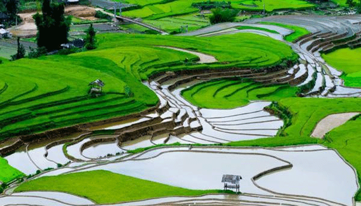 Mu Cang Chai: Les rizières ici se suivant, les unes les autres, semblent être interminables. Parmi environ 2.200 hectares de terrasses, il y a 500 hectares à trois communes: La Pan Tan, Che Cu Nha et De Xu Phinh reconnues comme l'un des paysages uniques, le Patrimoine National du Vietnam en 2007. Vous allez conquérir le col Khau Pha – Un défit agréable de la balade en moto avec les vues uniques.